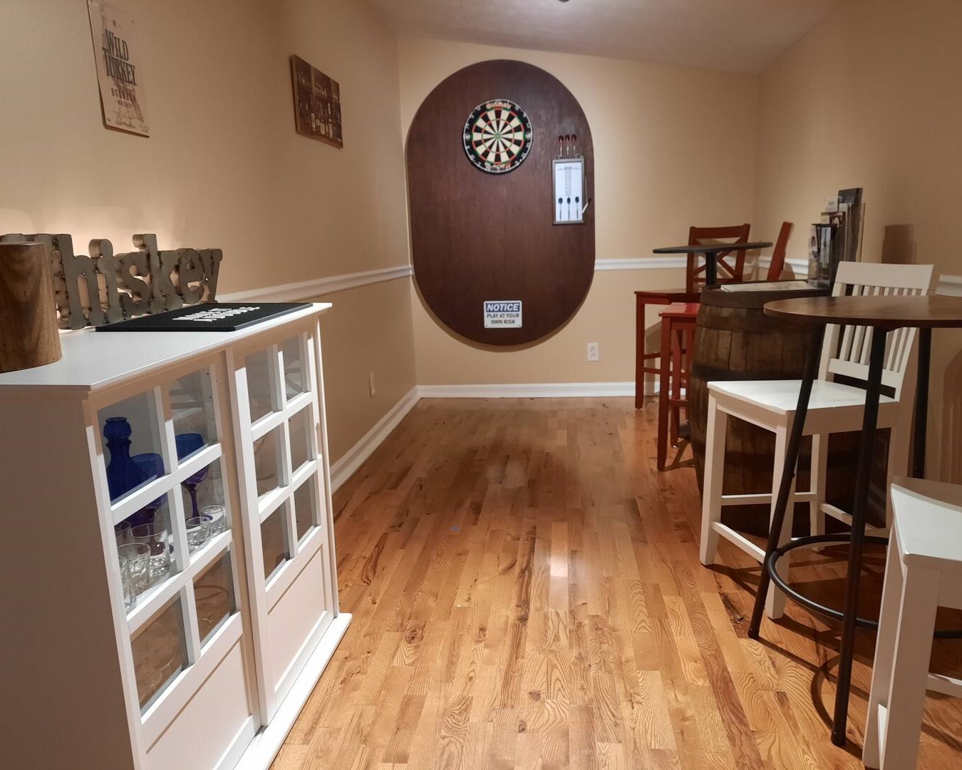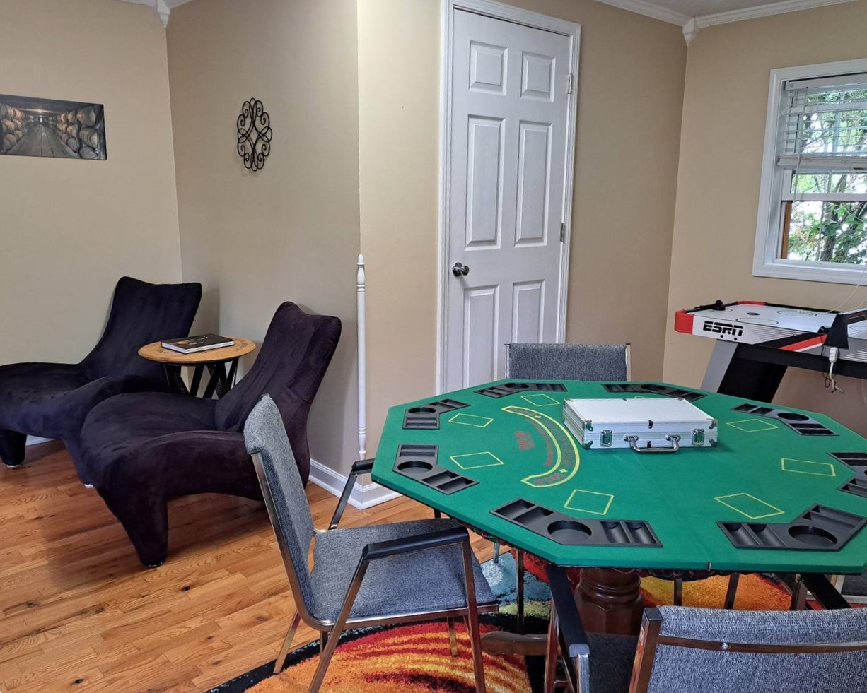 Game Room: Air hockey, poker/blackjack table, lounge with bar tables, dart board, glassware.