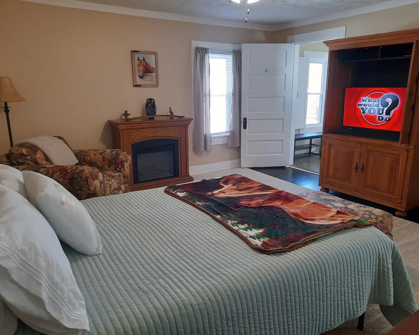 Master Bedroom: Queen bed, en suite bathroom, 40" Roku TV, electric fireplace, private